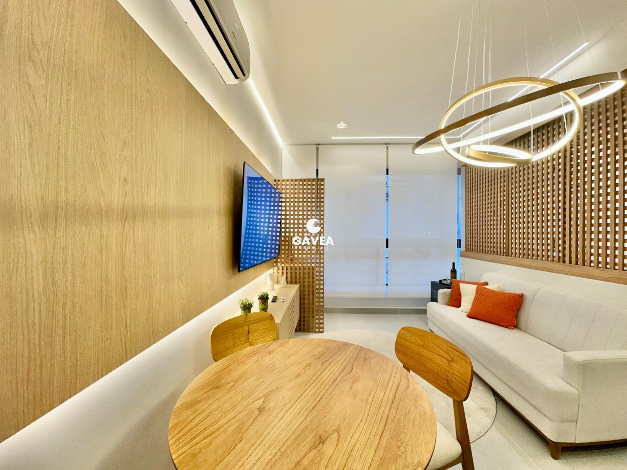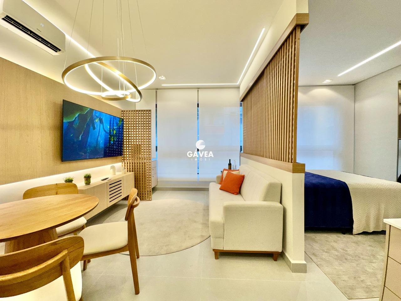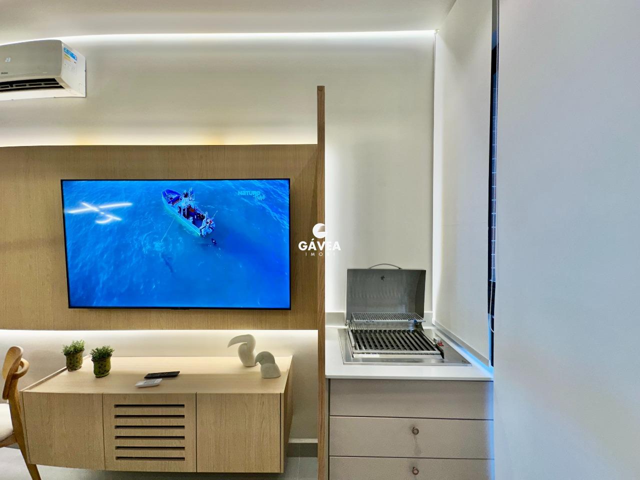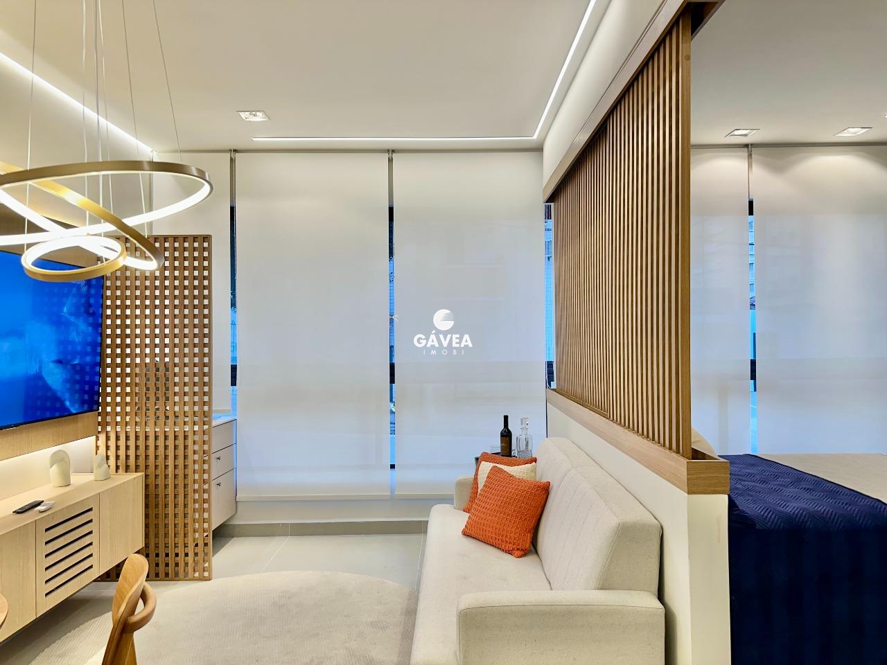 O imóvel conta com 1 banheiro bem distribuído, vaga rotativa (com 60 vagas disponíveis no prédio, além de estacionamento ao lado), e uma vista privilegiada – podendo ser para o mar ou para o morro do Barbosa, conforme a unidade.
