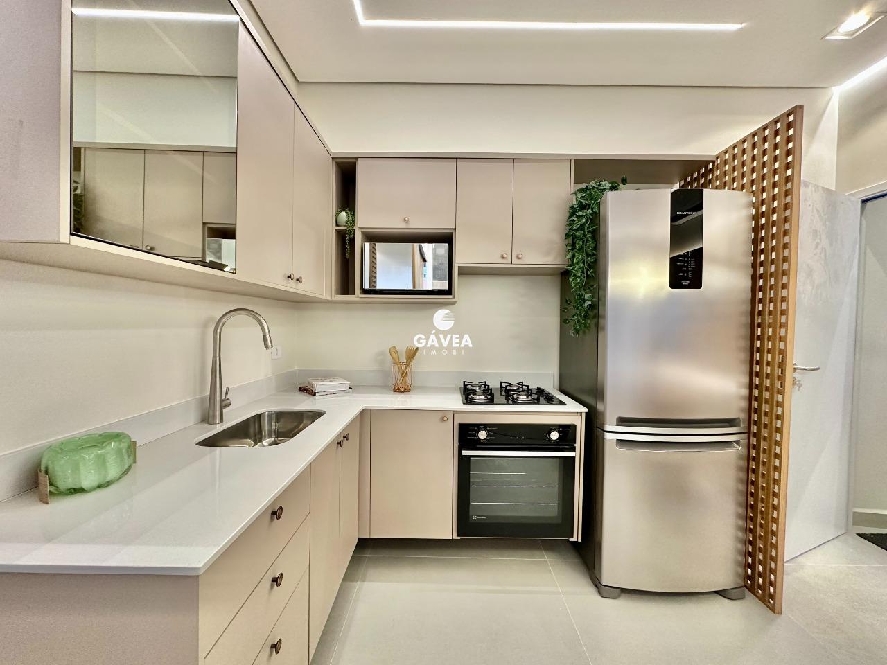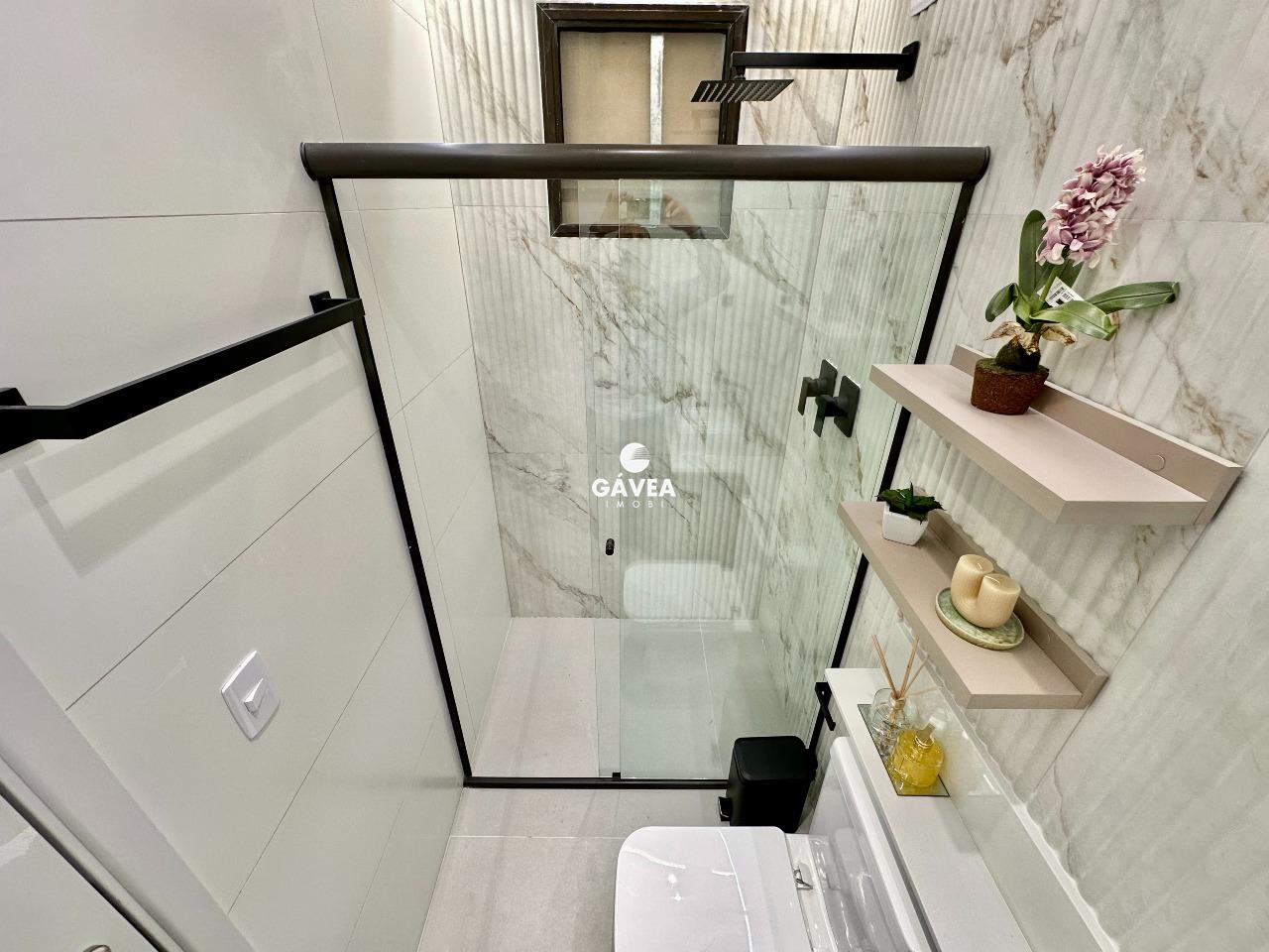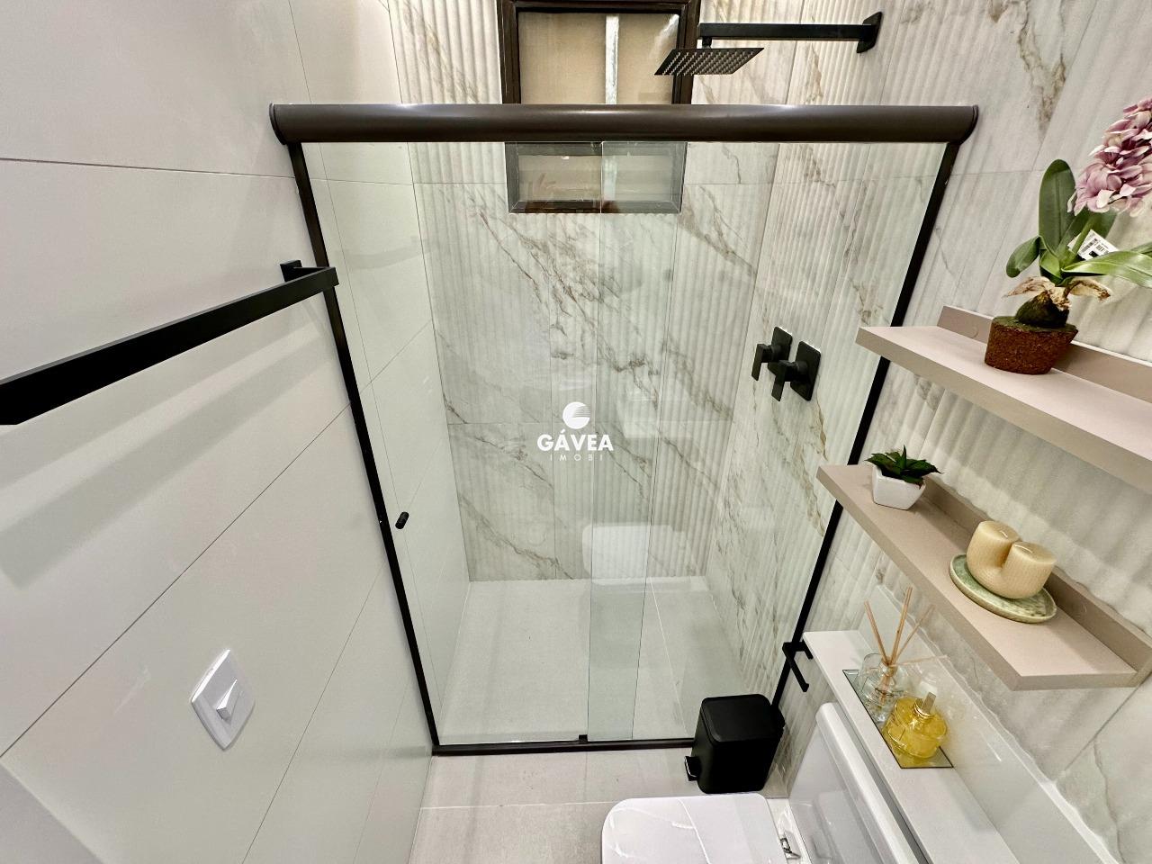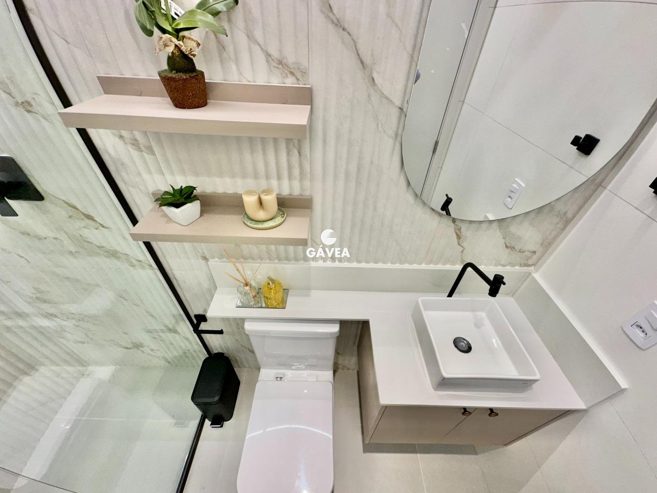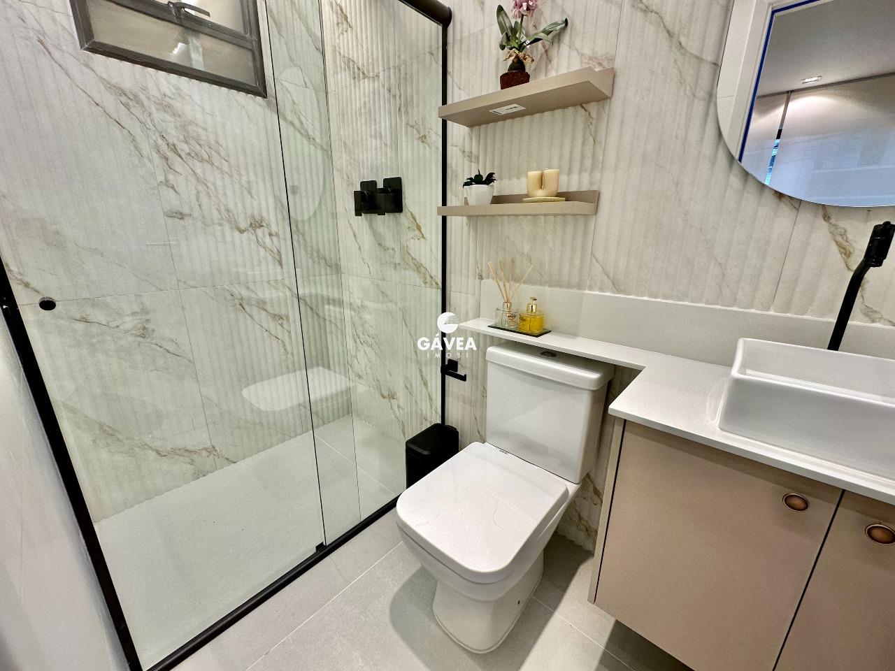 O imóvel conta com 1 banheiro bem distribuído, vaga rotativa (com 60 vagas disponíveis no prédio, além de estacionamento ao lado), e uma vista privilegiada – podendo ser para o mar ou para o morro do Barbosa, conforme a unidade.