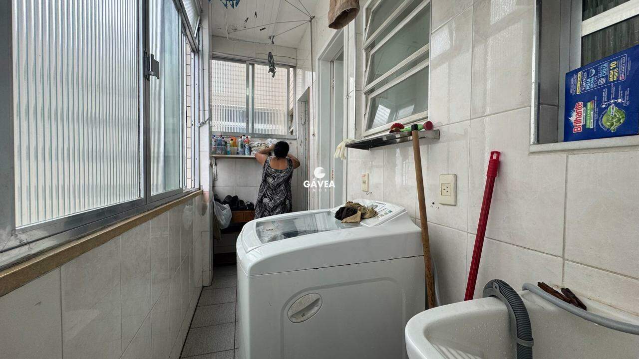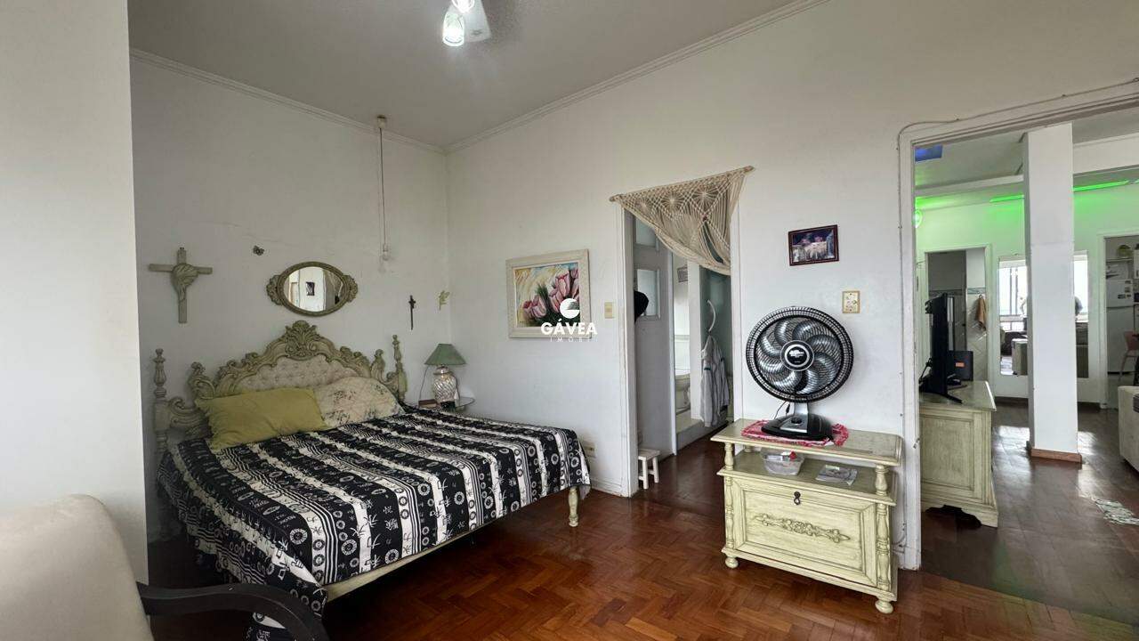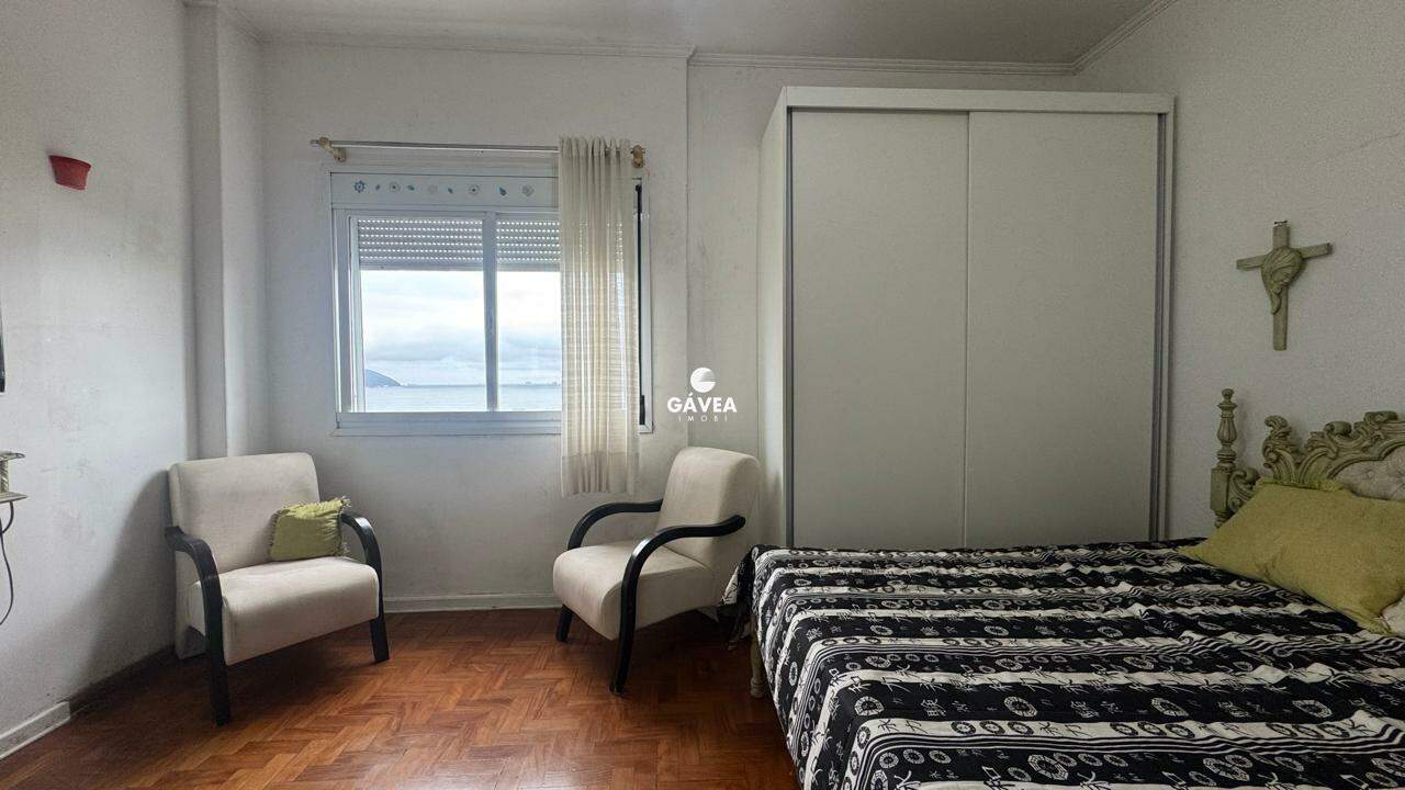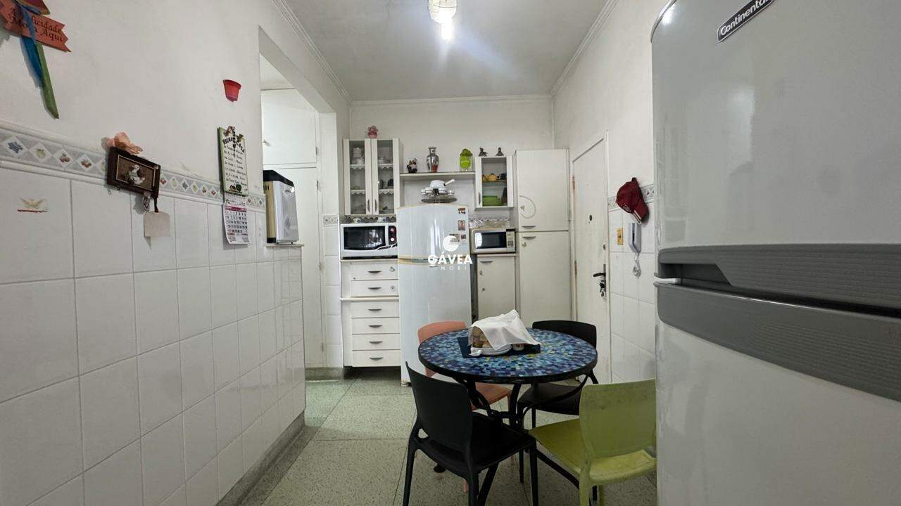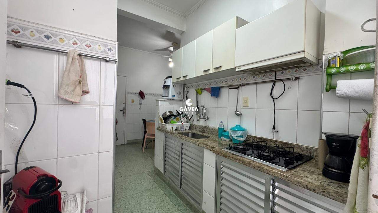 A sala ampla para dois ambientes também oferece vista mar, garantindo luminosidade natural e um ambiente arejado. Possui banheiro social, copa, cozinha funcional, área de serviço, dependência completa de empregada (DPC) e uma vaga de garagem com manobrista, trazendo ainda mais comodidade ao seu dia a dia.