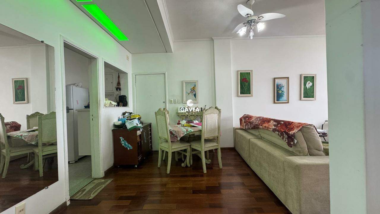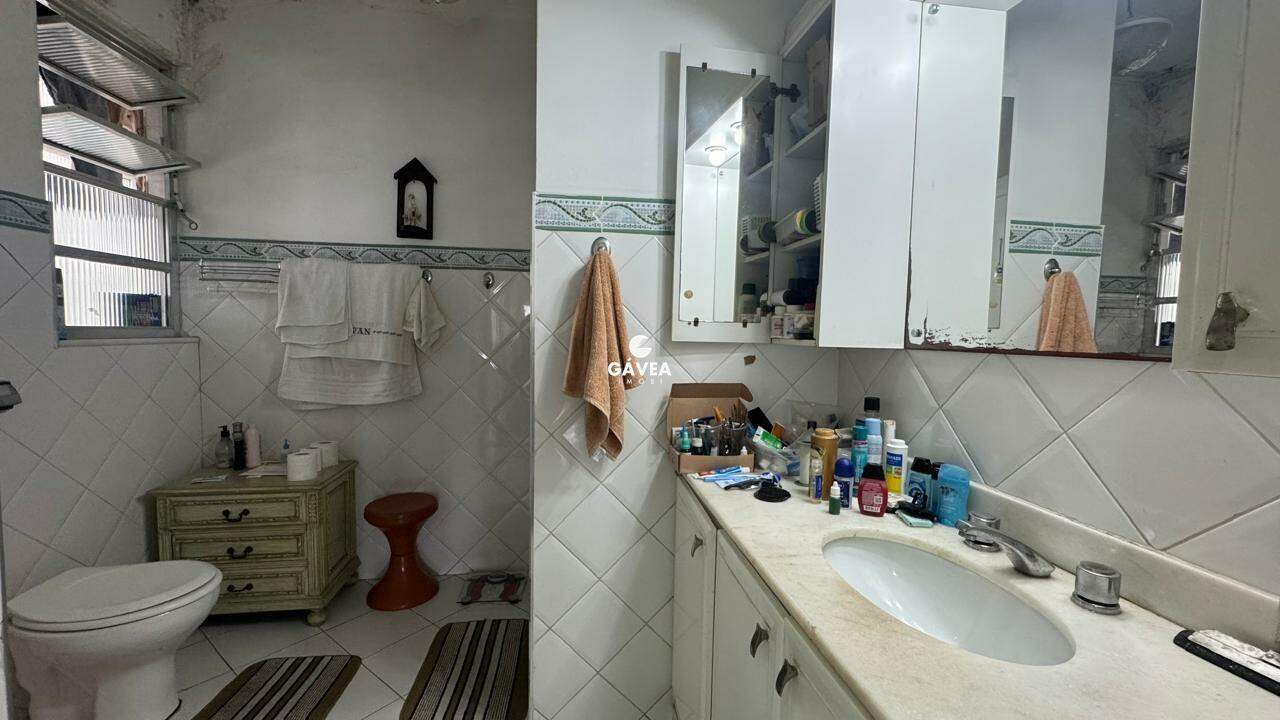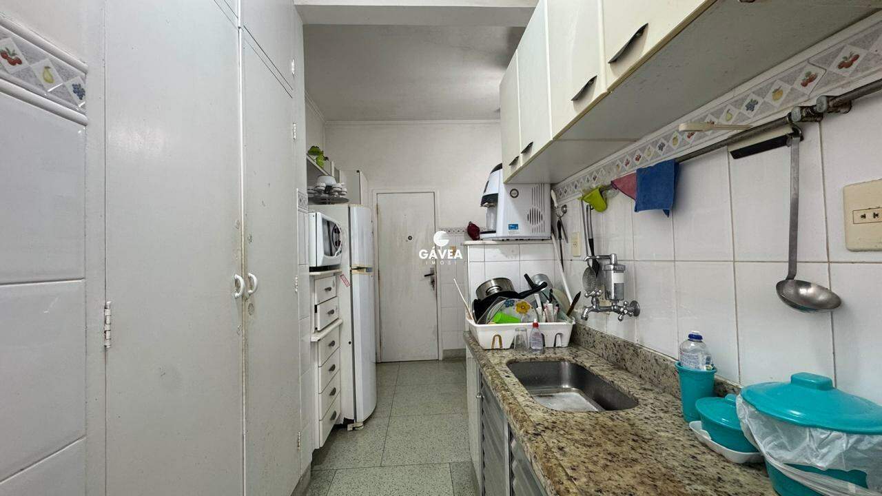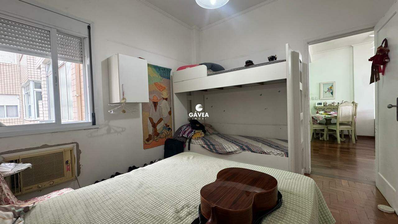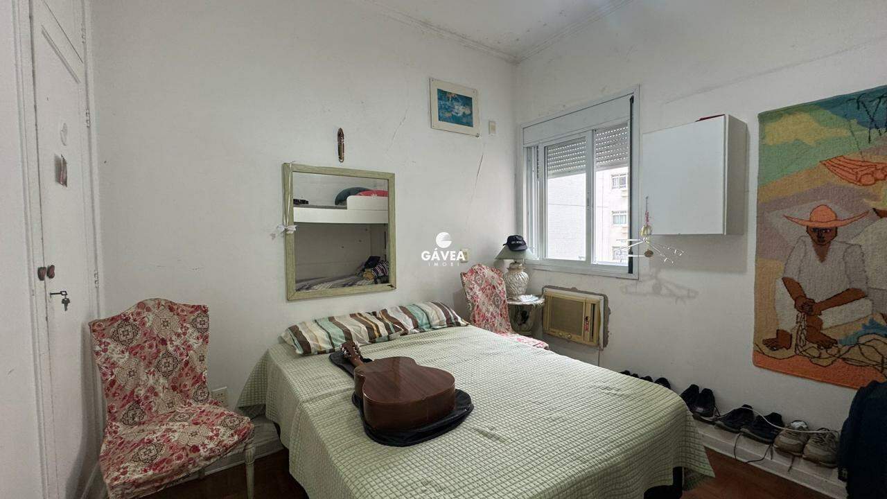 A sala ampla para dois ambientes também oferece vista mar, garantindo luminosidade natural e um ambiente arejado. Possui banheiro social, copa, cozinha funcional, área de serviço, dependência completa de empregada (DPC) e uma vaga de garagem com manobrista, trazendo ainda mais comodidade ao seu dia a dia.