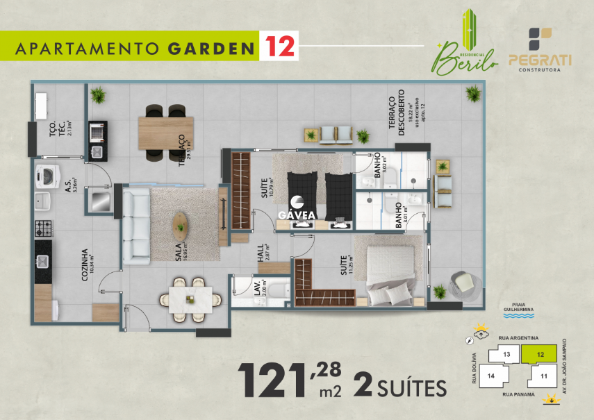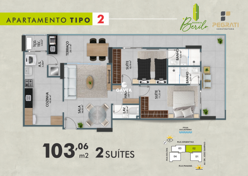 Localizado a apenas 4 quadras da praia, no bairro Guilhermina. Oferecemos apartamentos espaçosos, com duas suítes, variando de 87 m² a 189,98 m². Cada unidade possui sacadas gourmet e vagas demarcadas, proporcionando comodidade e conforto.