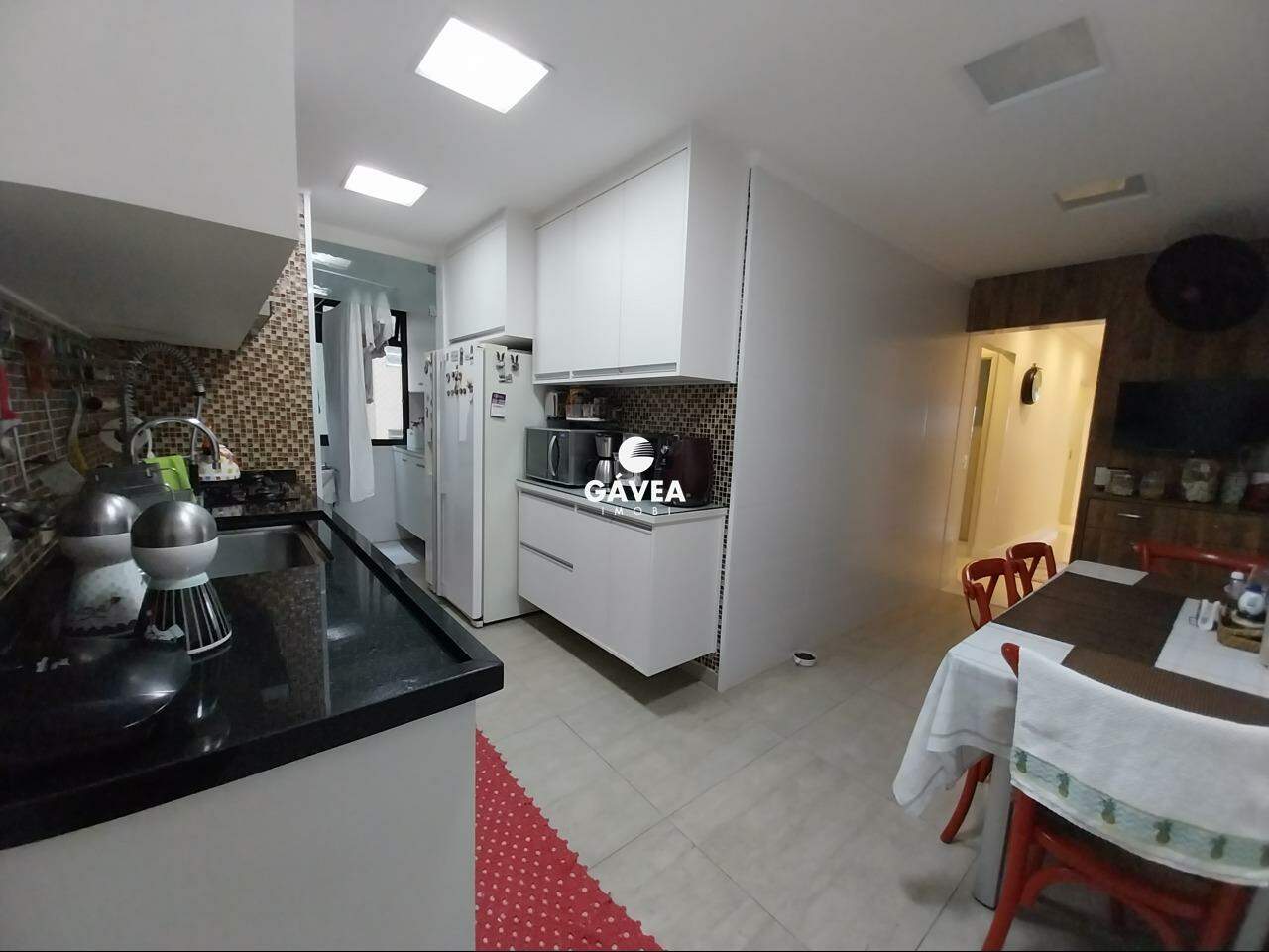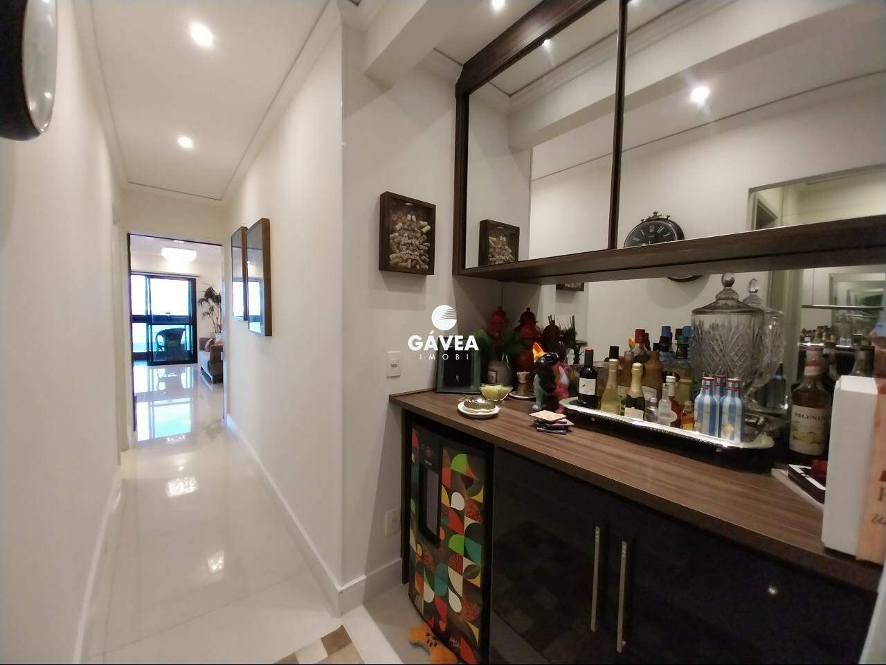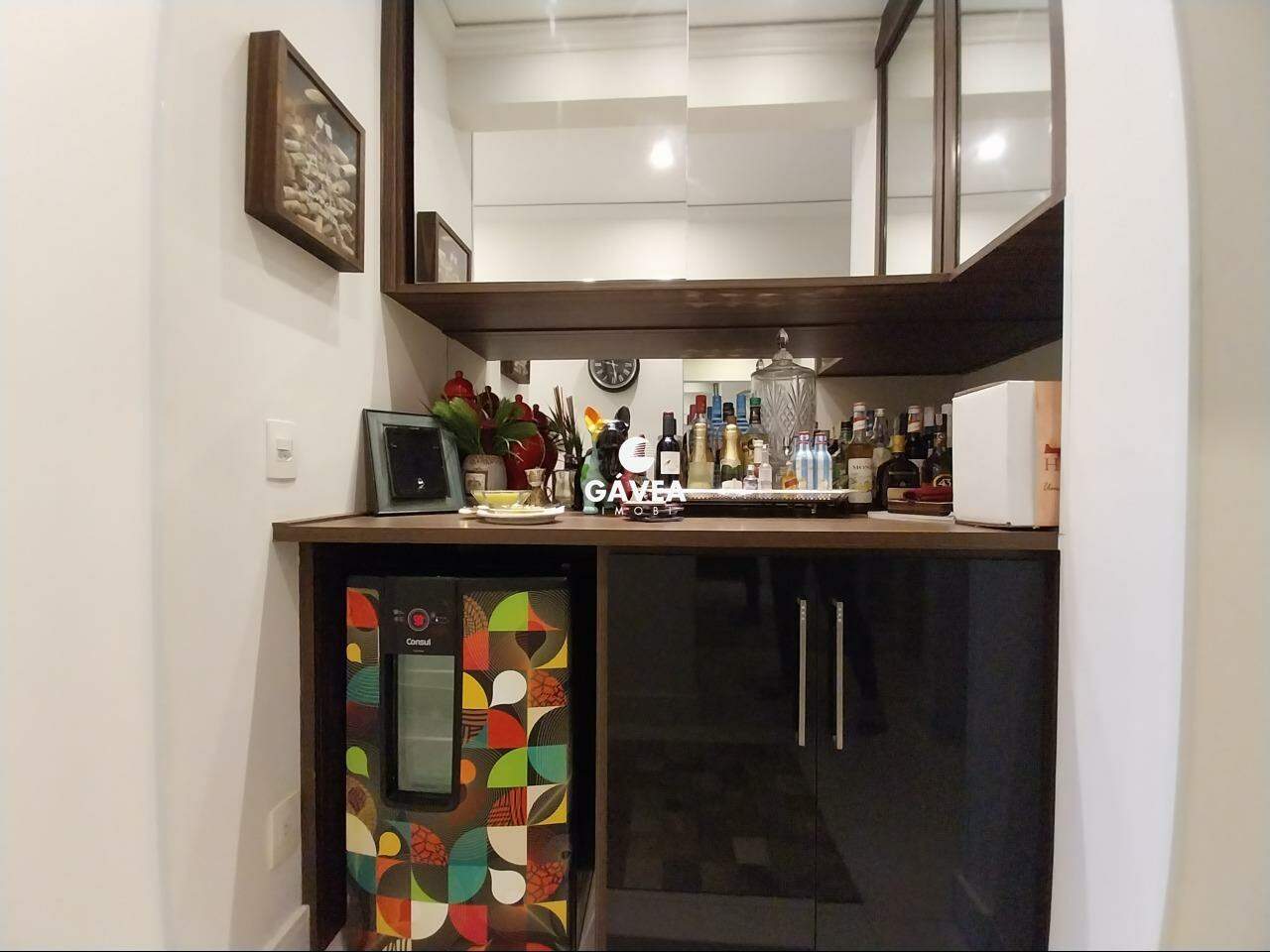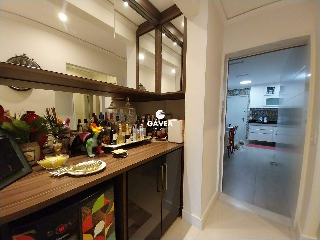 A cozinha é dividida em dois ambientes, totalmente planejada, e conectada a uma área de serviço separada, com despensa reversível em dependência de empregada. O imóvel também possui lavabo, adega/bar montado com elegância, ventiladores de teto nos quartos e sala, além de ar-condicionado, móveis planejados em todos os cômodos e duas entradas independentes.