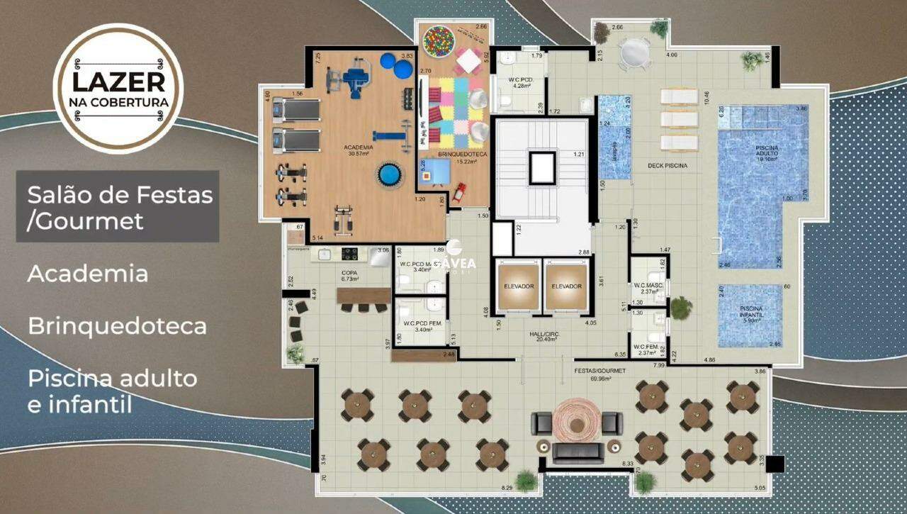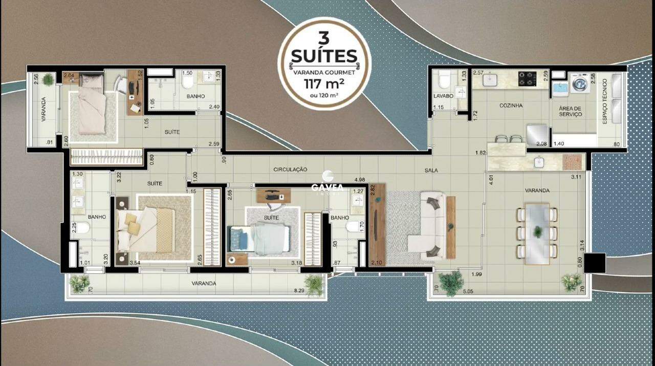 117 m²: 3 suítes, varanda gourmet, sala para 2 ambientes, cozinha com armários planejados, área de serviço.