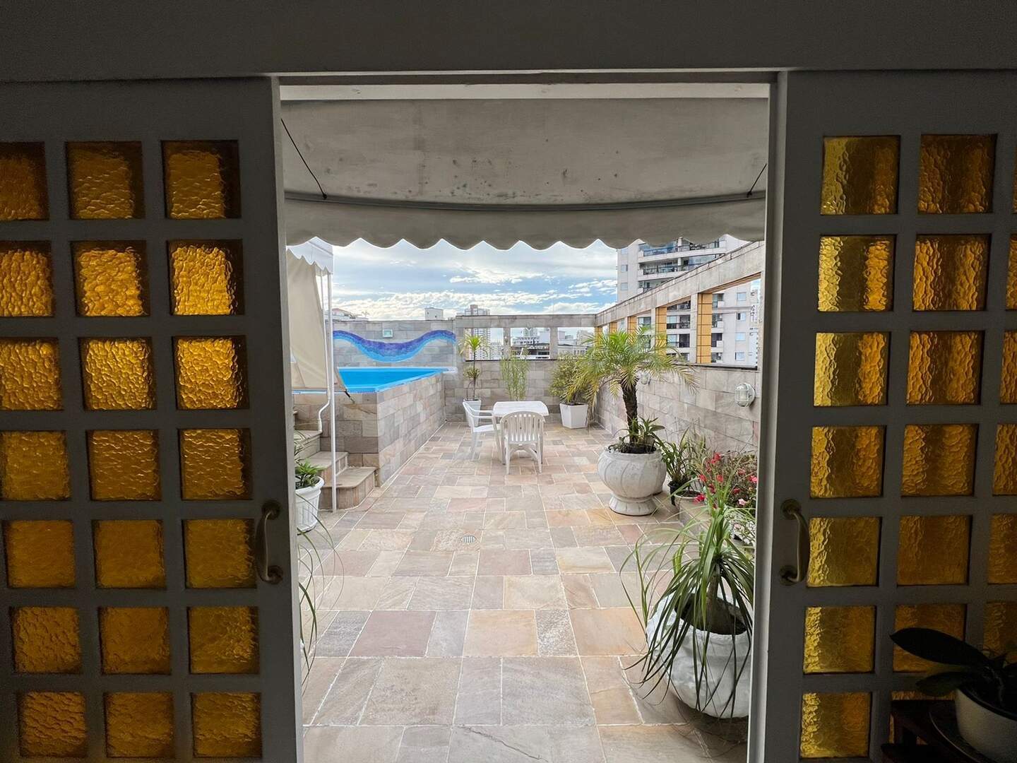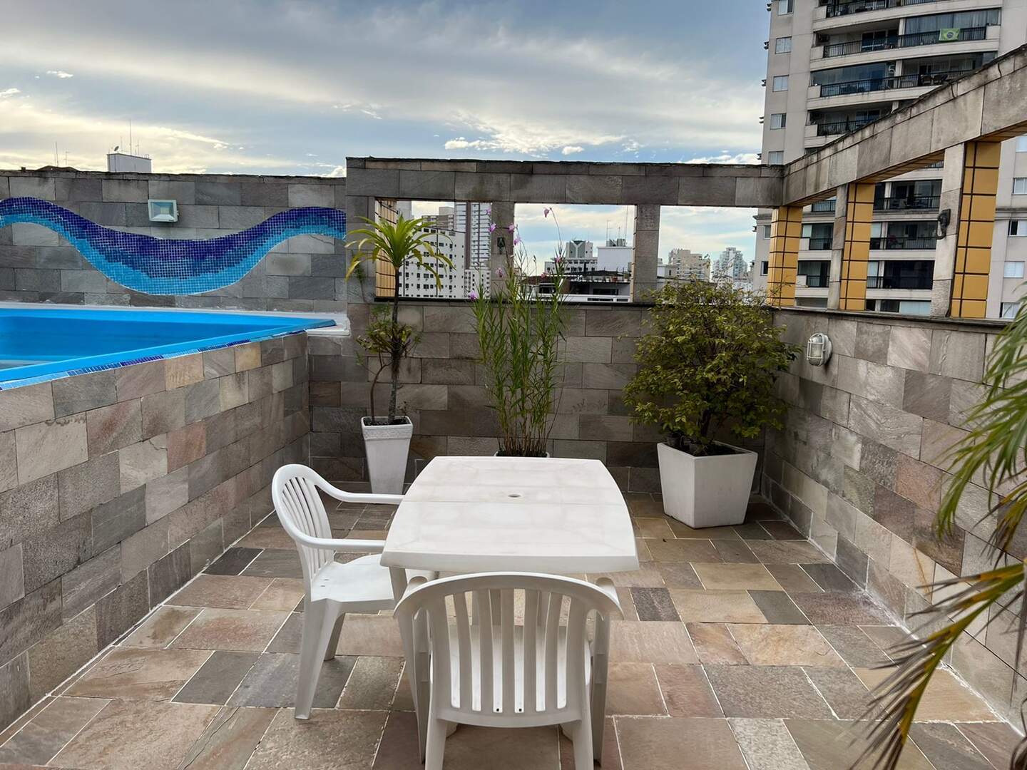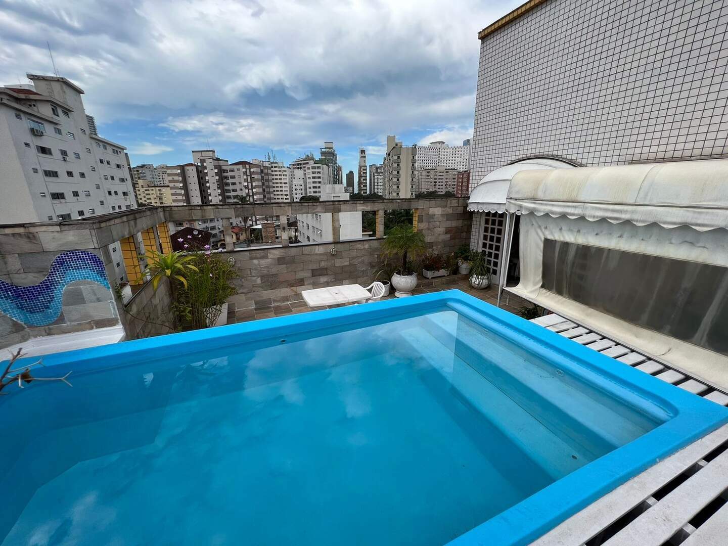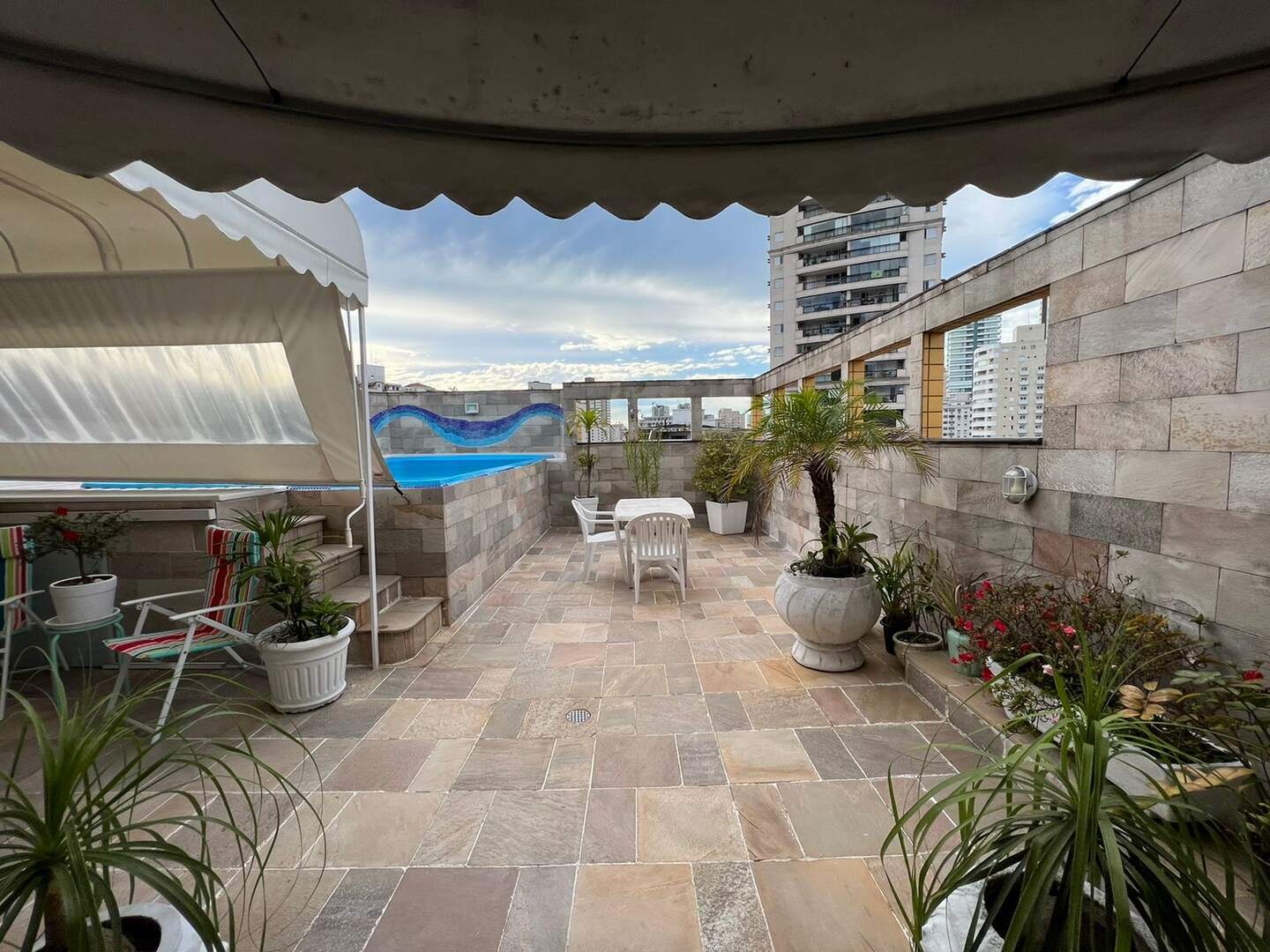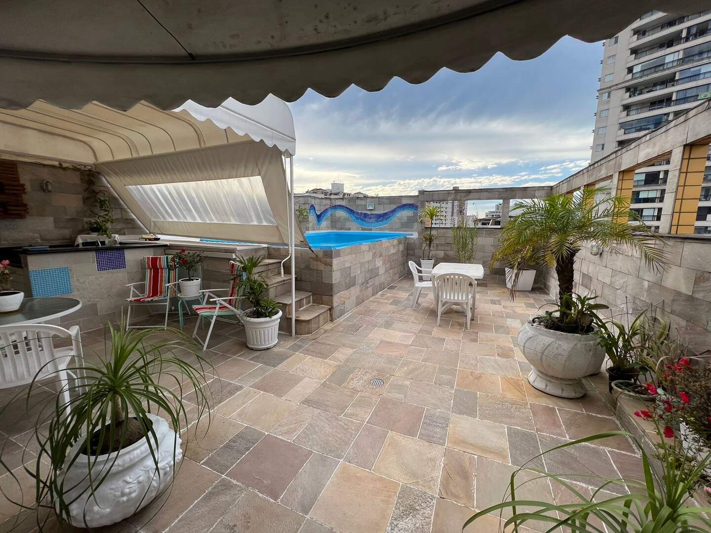 Parte superior sala, espaço Lazer com piscina, churrasqueira e solarium.