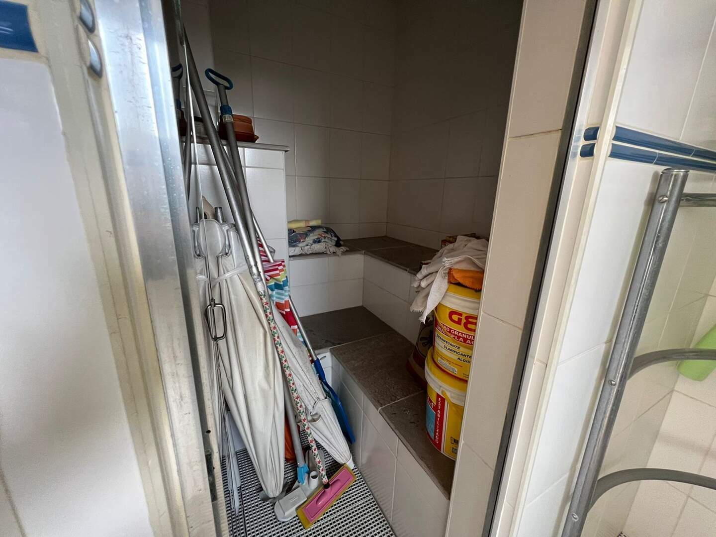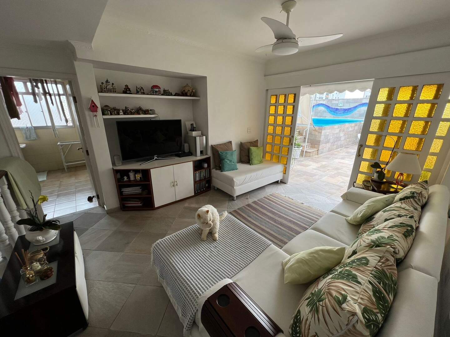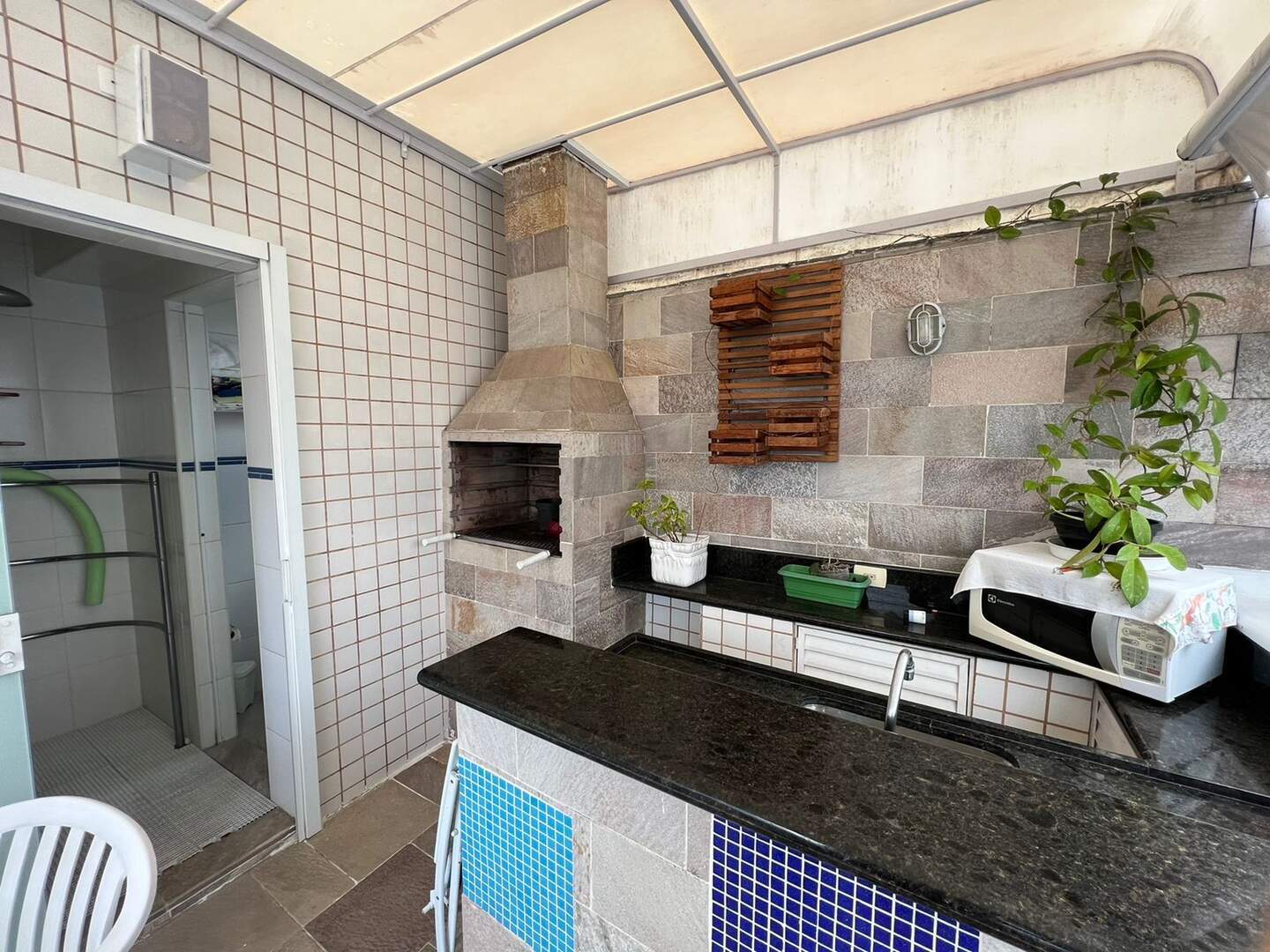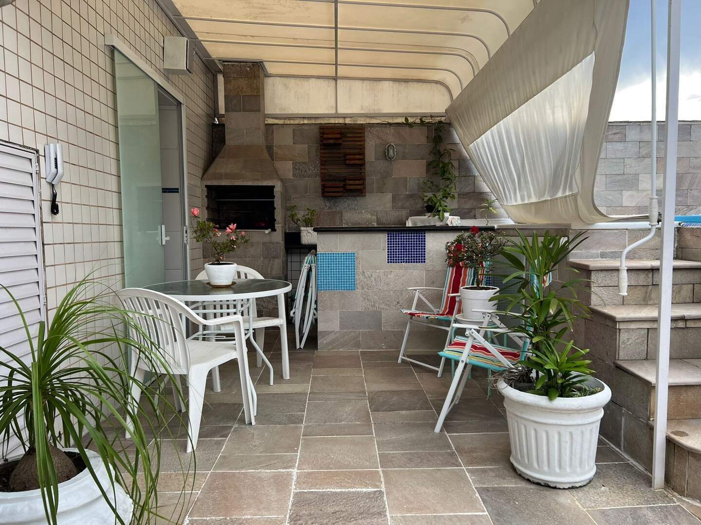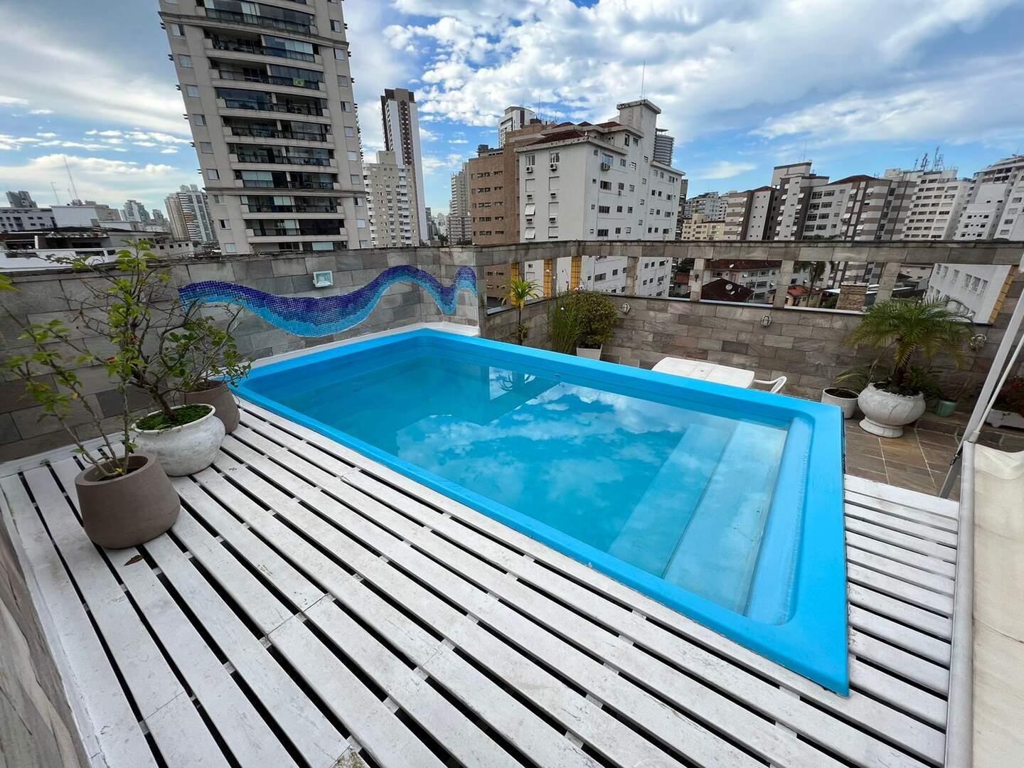 Parte superior sala, espaço Lazer com piscina, churrasqueira e solarium.