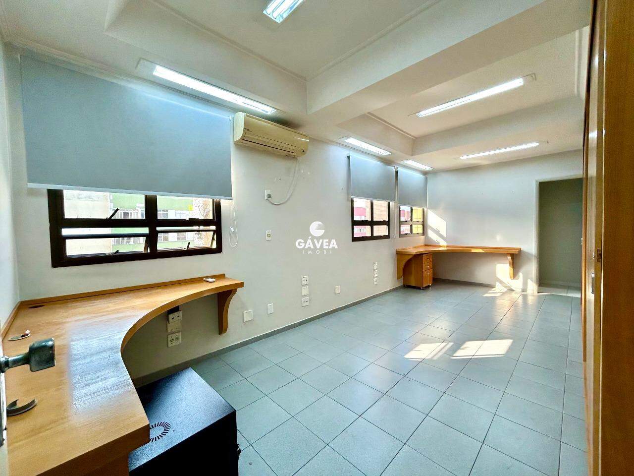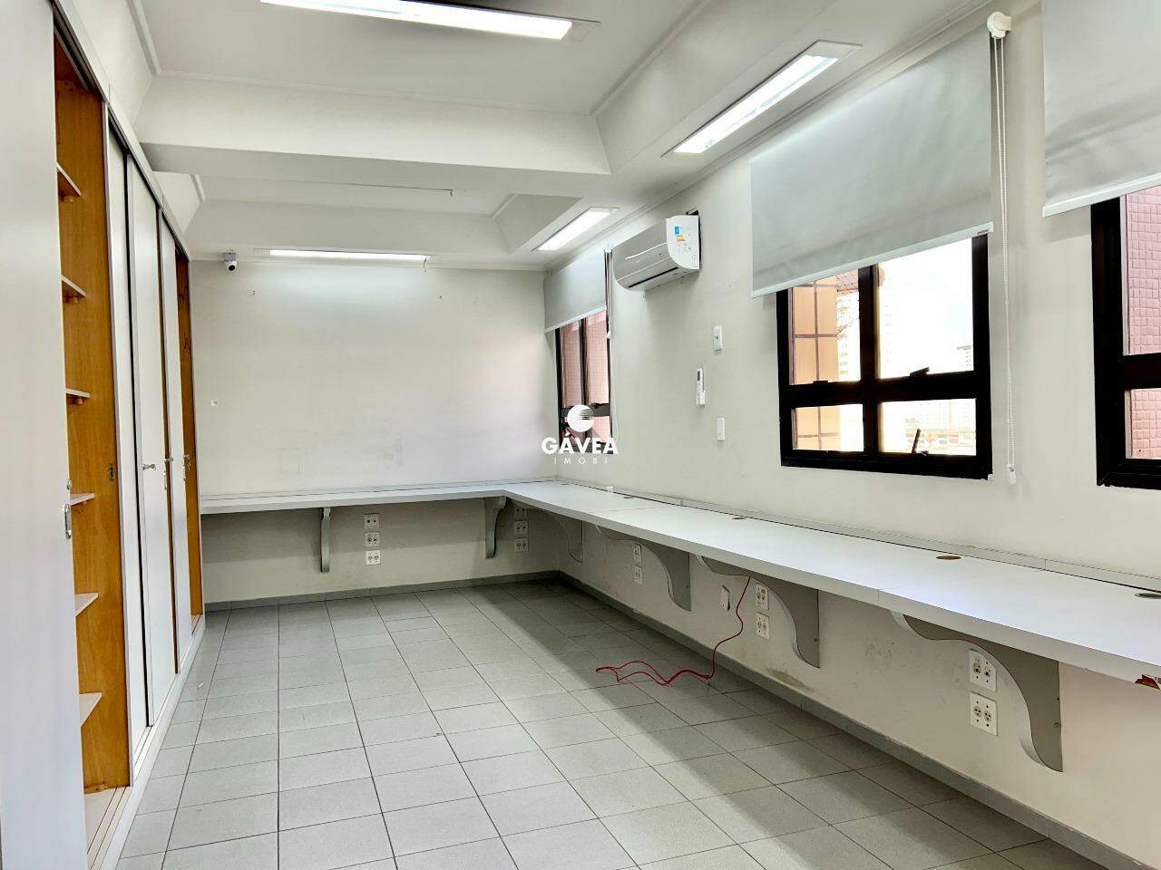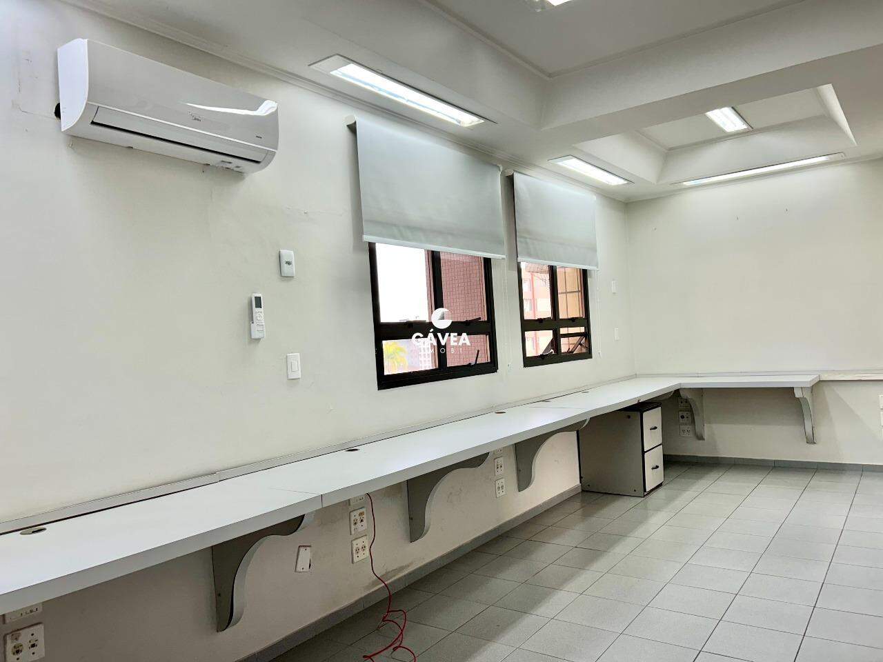 A sala conta com uma recepção, 4 amplas salas equipadas com mesas e armários embutidos, 3 banheiros e uma copa. Todos os ambientes são climatizados e possuem persianas, garantindo conforto e privacidade. Ainda conta com 2 vagas de garagem demarcadas e livres.