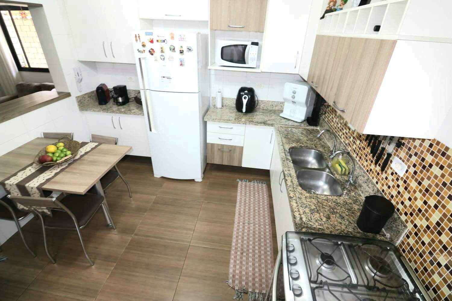 Cozinha americana ampla com ventilação natural e com azulejo até o teto.