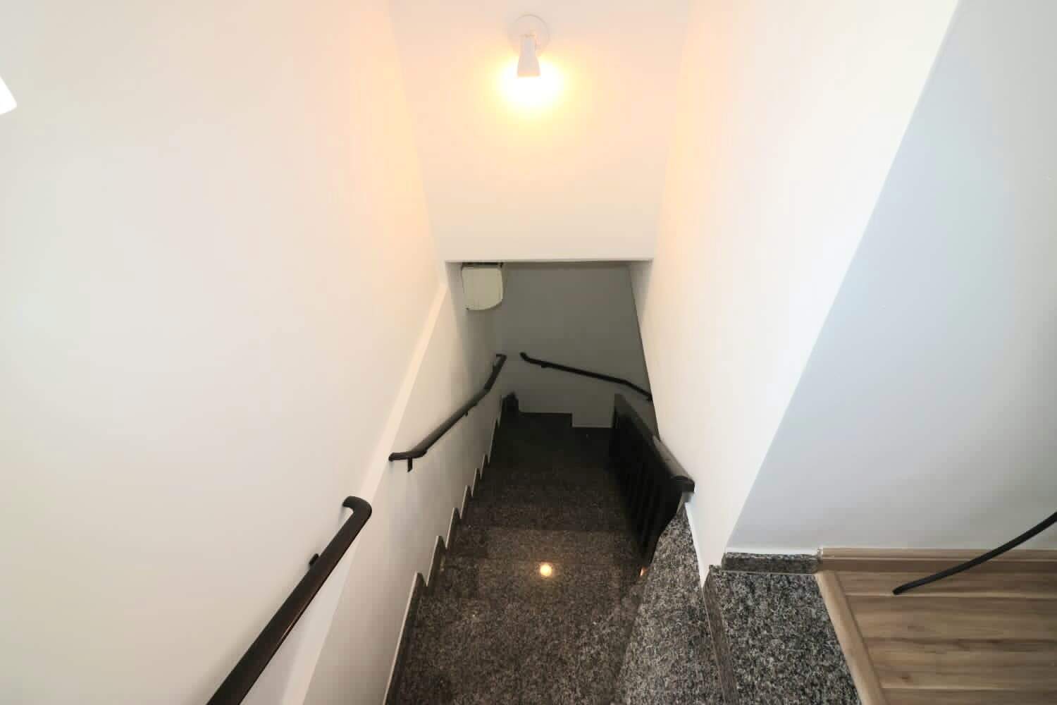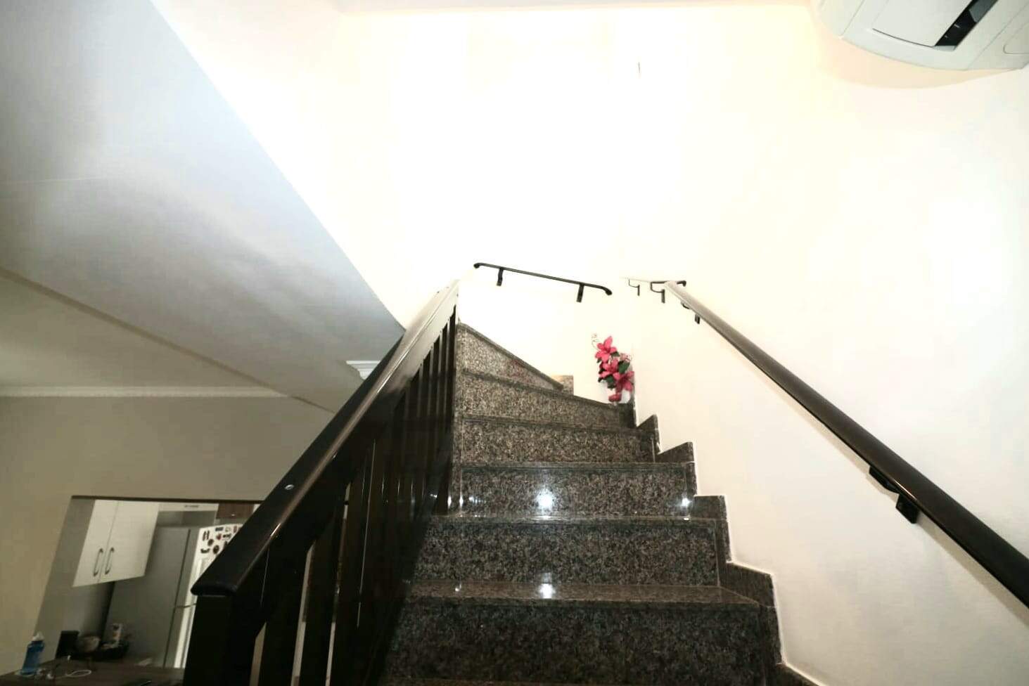 Escadaria de acesso ao pavimento superior em granito cinza com 3 quartos amplos, todos com piso de madeira e ventilador de teto, bastante arejados e com muita iluminação e um banheiro grande com Box.