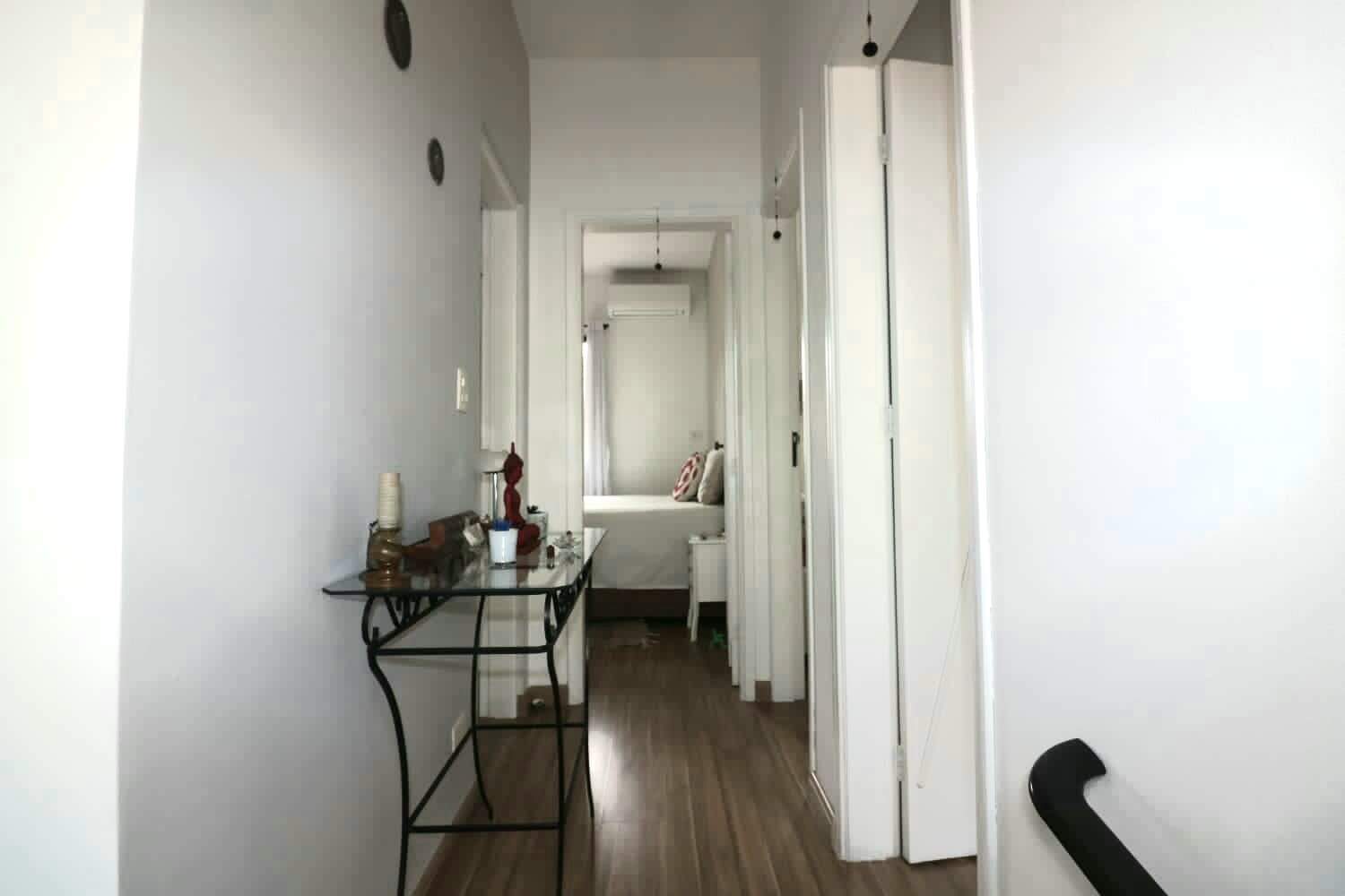 Sala arejada com ótima iluminação, toda em piso vinílico, porta em madeira maciça envernizada e ventilador de teto.
